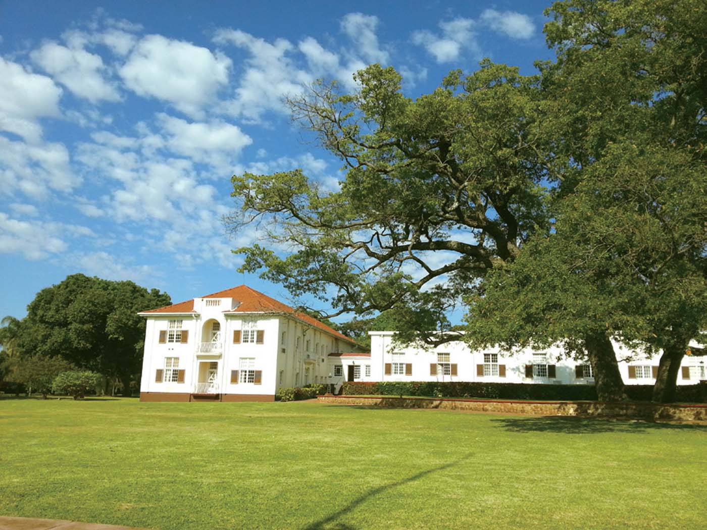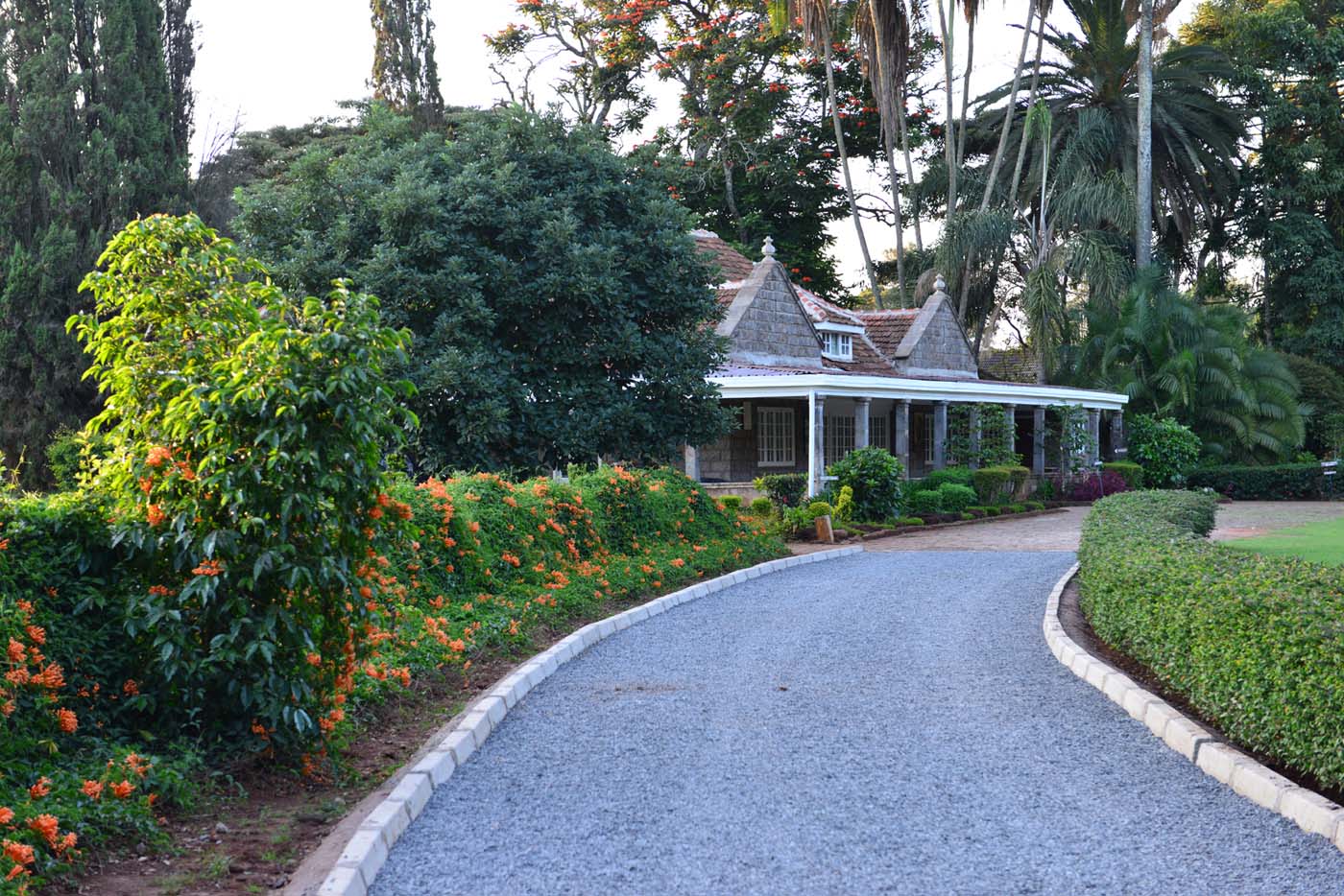 我是帶著尋夢的心情來到卡倫故居的。這是一座偌大的莊園,開闊的草場,參天大樹,凌霄花編織了一道長長的籬笆墻。花木掩映間,是一棟和非洲民居截然不同的歐式鄉(xiāng)村別墅,優(yōu)雅的白色英式門窗,舒適的遮雨回廊,淡褐色石墻經(jīng)歷熱帶風雨的洗刷,已經(jīng)頗有些斑駁。屋后還有一株高大的非洲火焰樹,樹冠綴滿灼目的紅花,草場盡頭果然可以望見連綿的恩恭山。