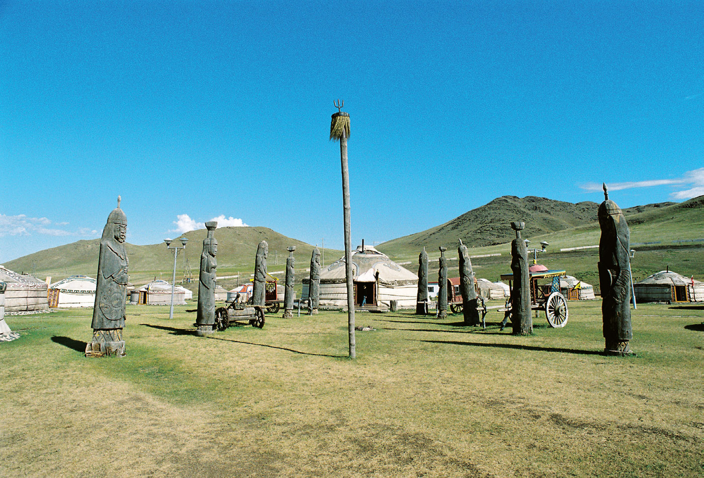 在遙遠的古代,交通不便,信息不通,地理不詳,發(fā)動這樣的長途征戰(zhàn)應是異常艱難的。2004 年,我率新華社代表團到蒙古訪問,從中蒙航線的飛機上望下去,視線所及是一片黃沙漫漫的千里戈壁,直到臨近烏蘭巴托寶音烏哈機場,大地才現(xiàn)出綠色,那是圖拉河從山谷間的盆地流過,留下的一抹狹長綠洲。
