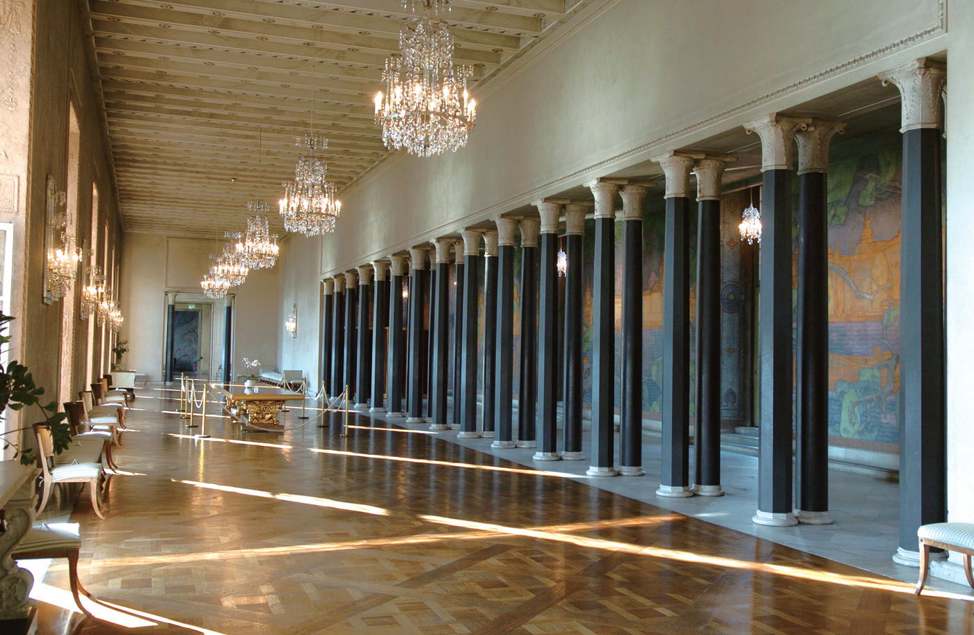 我們帶著幾分驚訝,在這座超大建筑里走馬觀花地看了一遍。我總結(jié)一是大廳多,二是走廊長。27 個大小不同的廳構(gòu)成了一道獨特的風景線,宮內(nèi)大廳多數(shù)是以羅馬尼亞歷史人物的名字命名。橢圓型的二樓會議廳富麗堂皇,頂部是天窗式玻璃穹頂,極盡奢華。還有給人印象深刻的中央大廳,面積2200 平方米,是仿照奧地利的皇宮設計的。廳內(nèi)裝飾氣派非凡,四周墻壁和天花板鑲有精制的木雕。屋頂高達16 米, 3 盞大吊燈每盞3 米長,在天花板上猶如閃爍的群星,站在這樣的星空下,人顯得多少有點兒渺小。面向廣場一側(cè)的走廊長150 米,寬18 米,和無數(shù)巨大的露臺相通,我們幾個中國人在里面穿過,竟有走在一條寬敞的大街上的感覺。
