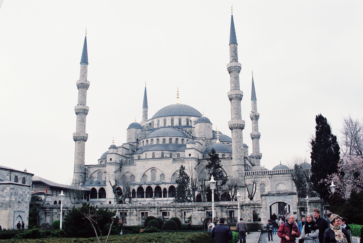 在西進的過程中,突厥人接受了一種新的宗教,就是由阿拉伯半島游牧民族創(chuàng)立的伊斯蘭教。他們把這種新宗教帶進了伊斯坦布爾。我親眼見到,基督教堂在這里被硬生生地改成清真寺。游覽圣地索菲亞大教堂,是拜占庭帝國皇帝查士丁尼于公元537 年建成的基督教堂,被公認為是整個基督教歷史上最恢弘的建筑。當年奧斯曼蘇丹穆罕默德懂得這座建筑的文物價值,在戰(zhàn)火中刻意把它保留下來,只是換了名稱,拆除牧師講道臺,改作穆斯林禮拜的場所,昔日的基督教堂里從此每天五遍回響著《古蘭經(jīng)》的誦讀聲。直到今天,這座穹頂宏大的建筑門廊墻皮剝露處,仍露出基督教題材的鑲嵌畫。