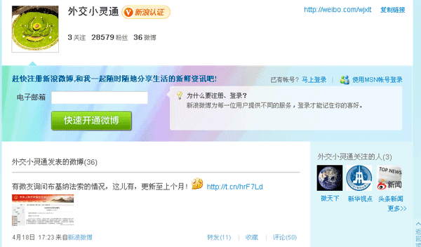 外交部開微博6天引2萬網友關注 系國內首個部委微博
